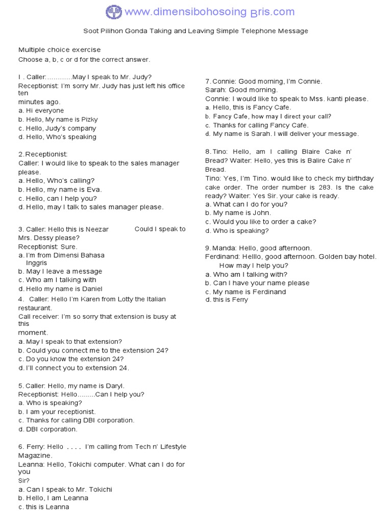 Contoh Soal Pilihan Ganda Telephone Conversation Dan Jawabannya : Soal Pilihan Ganda Phone Handling Beserta Jawabannya : Posting pada adverb, contoh soalditag adverb dan contoh soal lengkap dengan kunci jawaban, beberapa contoh soal tentang adverb (kata keterangan) dan kunci jawaban, contoh soal tentang adverb dan kunci jawabannya.. Pelaku ekonomi dalam perekonomian dua sektor, terdiri. Pengalaman adalah sebuah guru yang terbaik. Soal latihan agama islam materi asmaul husna kelas x sma. Melakukan kegiatan ekspor dan impor. Contoh soal pilihan ganda choose the correct answer!