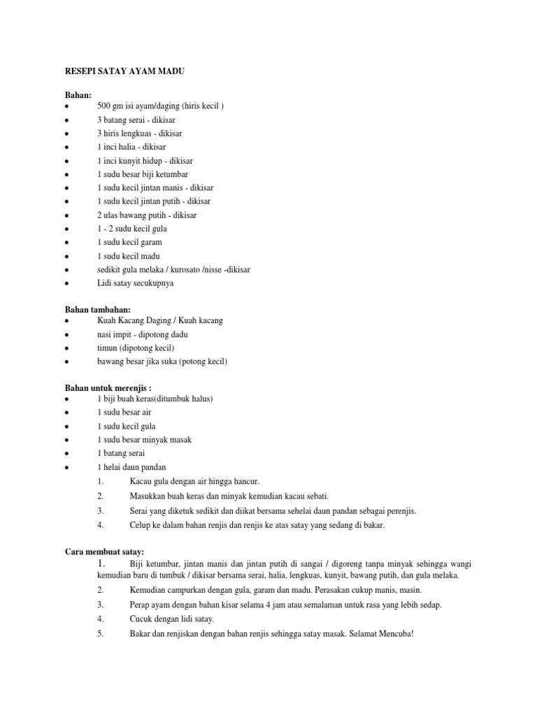 Resepi Sate Ayam from imgv2-2-f.scribdassets.com Bila sebut sate, sate ayam dan daging antara yang paling digemari ramai. Kacang tanah disangai tanpa minyak, dibuang kulitnya dan ditumbuk. Tetepi untuk kali ini, kami ingin kongsikan kepada anda resepi sate ayam dan daging yang dibakar melalui air fryer sahaja. Resepi ni boleh diguna untuk satay ayam/daging/kambing. Resepi sate ayam malaysia ini lembut, lazat dan boleh disediakan dengan kuali panggang. Anda boleh menggunakan daging dada ayam ataupun daging paha ayam. Resepi satay ayam sedap dan mudah written by hani widianti jumaat, 18 mac 2016 hari ini saya nak kongsikan resepi satay ayam sedap, satay ayam adalah adalah masakan kegemaran keluarga saya. Salam semua, nak share resepi satay dan kuah kacang yg saya niaga di bazar ramadhan.